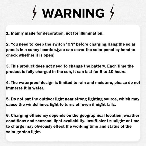 đ§Â Einfache Installation đ§ Dank des hochwertigen S-Hakens ist dieses Solar-Windspiel kinderleicht zu installieren. HĂ€ngen Sie es einfach an einen sonnigen Ort, stellen Sie sicher, dass der Schalter auf âONâ steht, und ĂŒberlassen Sie den Rest der Natur. Kein Werkzeug erforderlich, keine komplizierte Installation â einfach einstecken und loslegen!