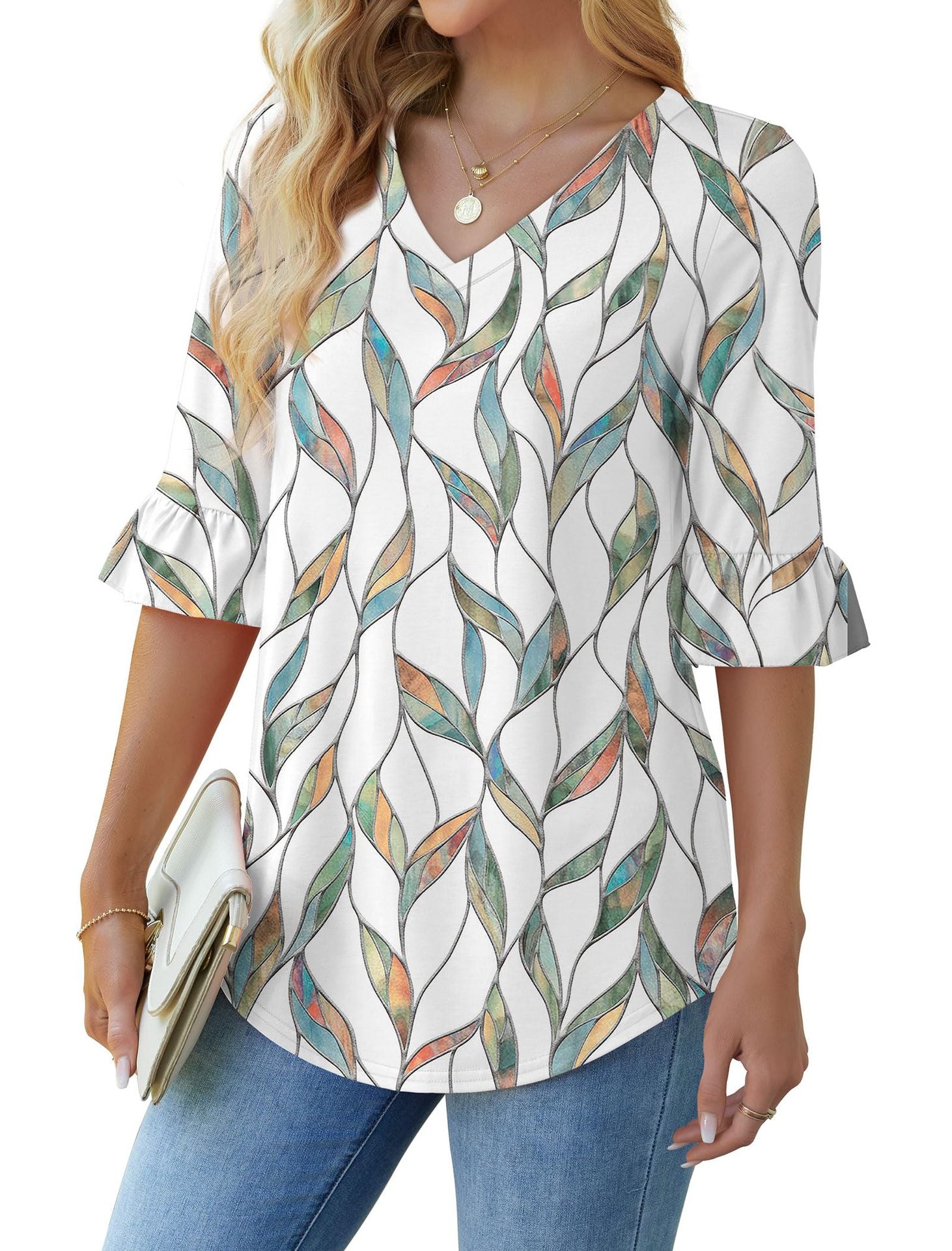 💕Limited time sale 50% off👚Womens 3/4 Length Sleeve V-Neck Eyelet Casual Ruffle Sleeve Tunic Blouses